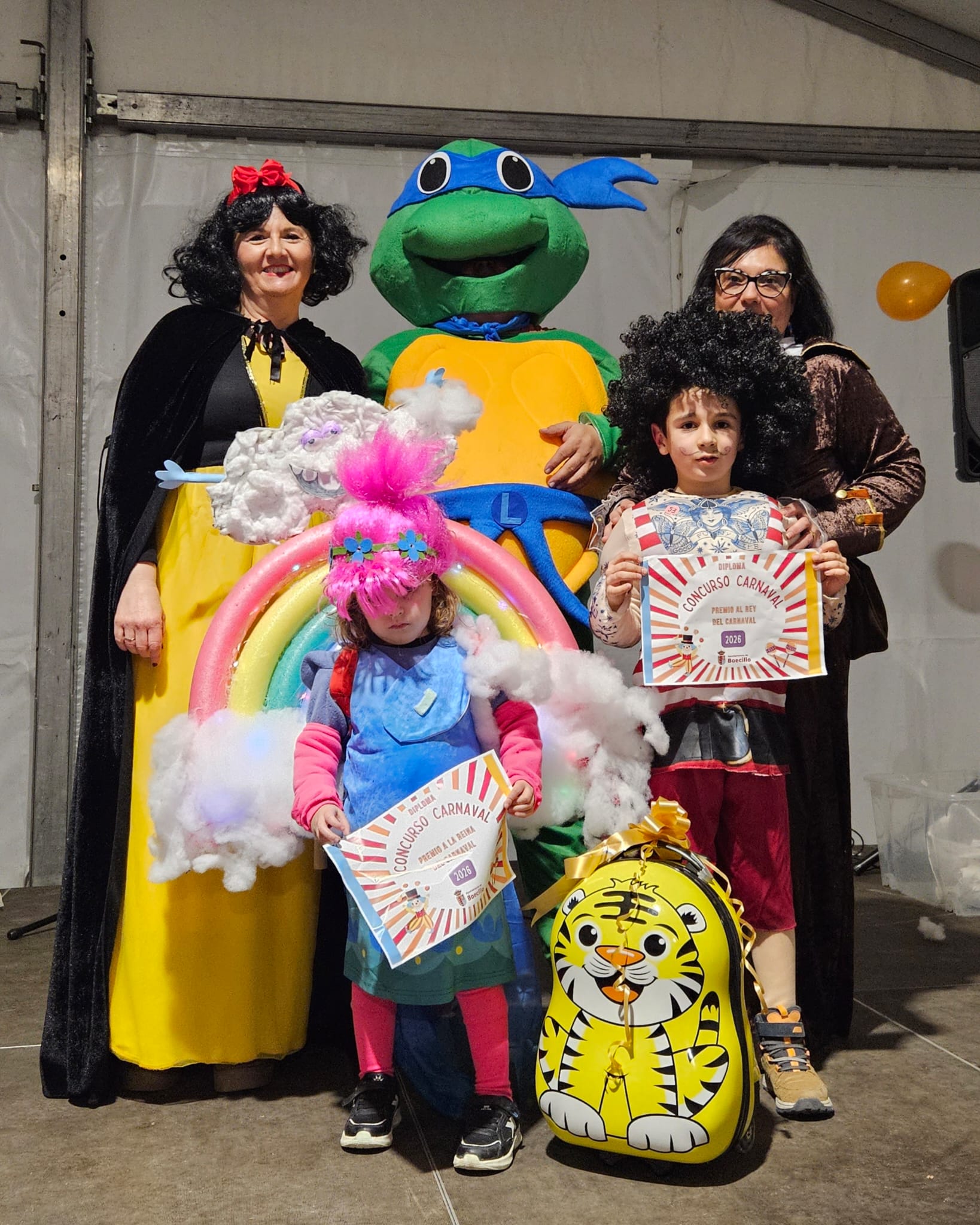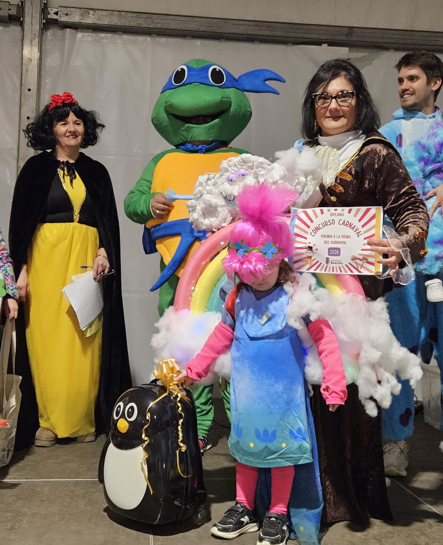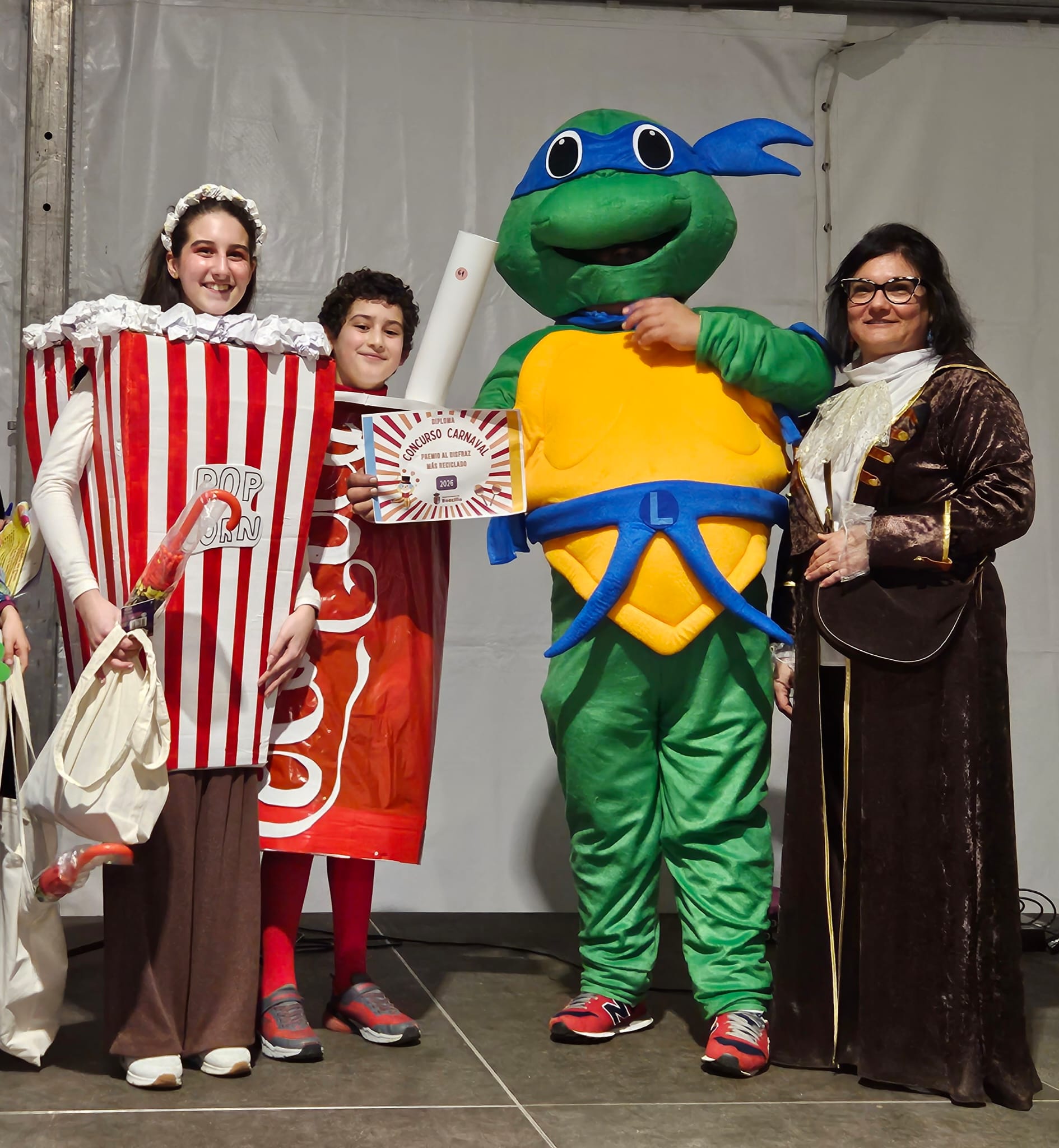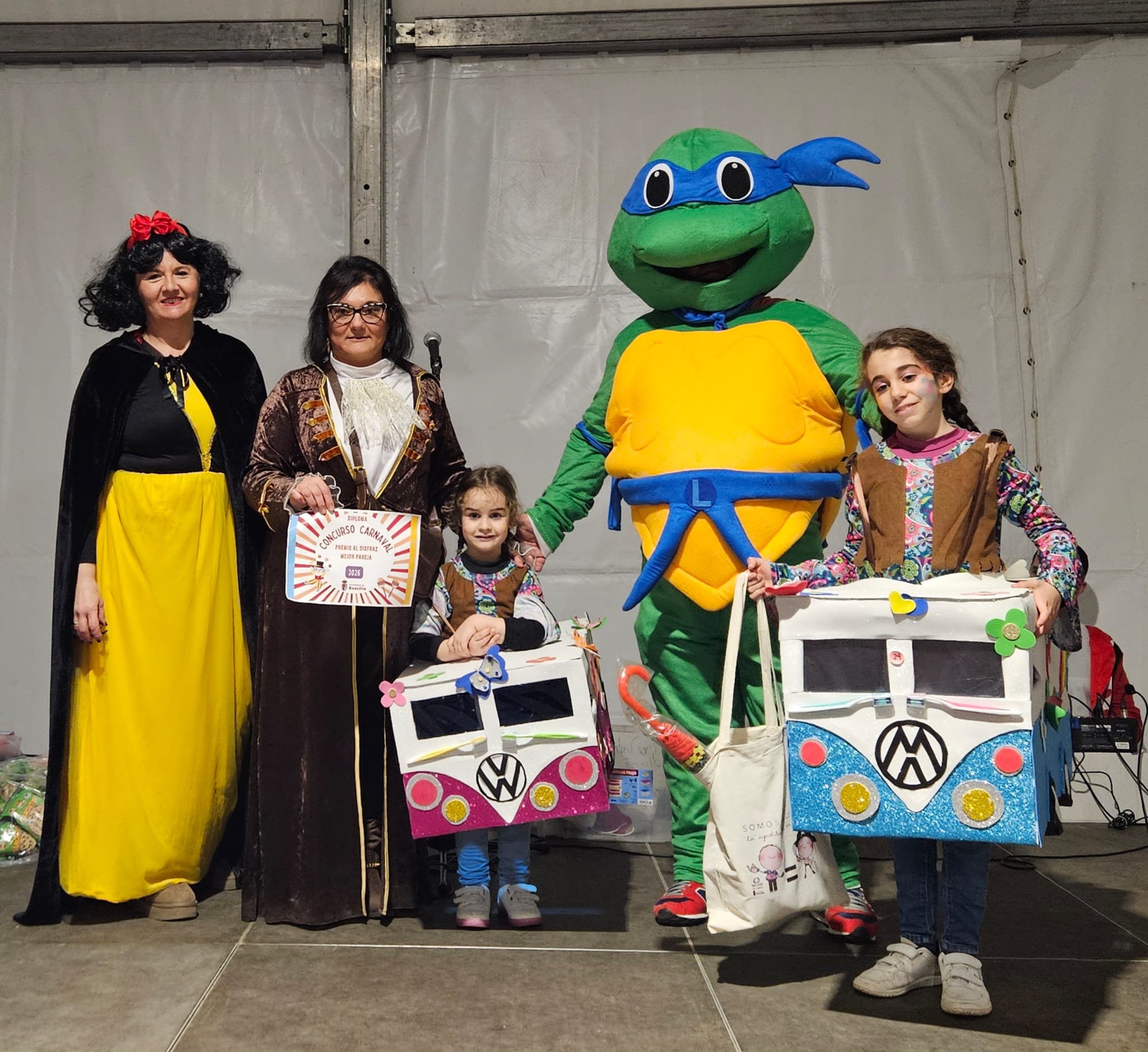 Por otro lado, los premios a mejores parejas fueron para unas particulares caniches y para las ‘hippies molonas’ con sus características furgonetas; mientras, el premio al disfraz más reciclado fue para ‘un combo de cine’ formado por su coca-cola y sus palomitas; y el premio para la familia mejor disfrazada fue para ‘la familia Sulivan’. Además, los pequeños reyes del carnaval fueron un sorprendente forzudo y la princesa del arco iris.