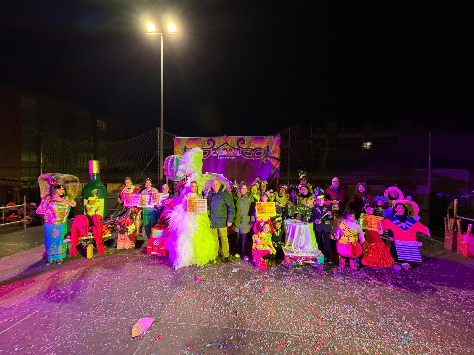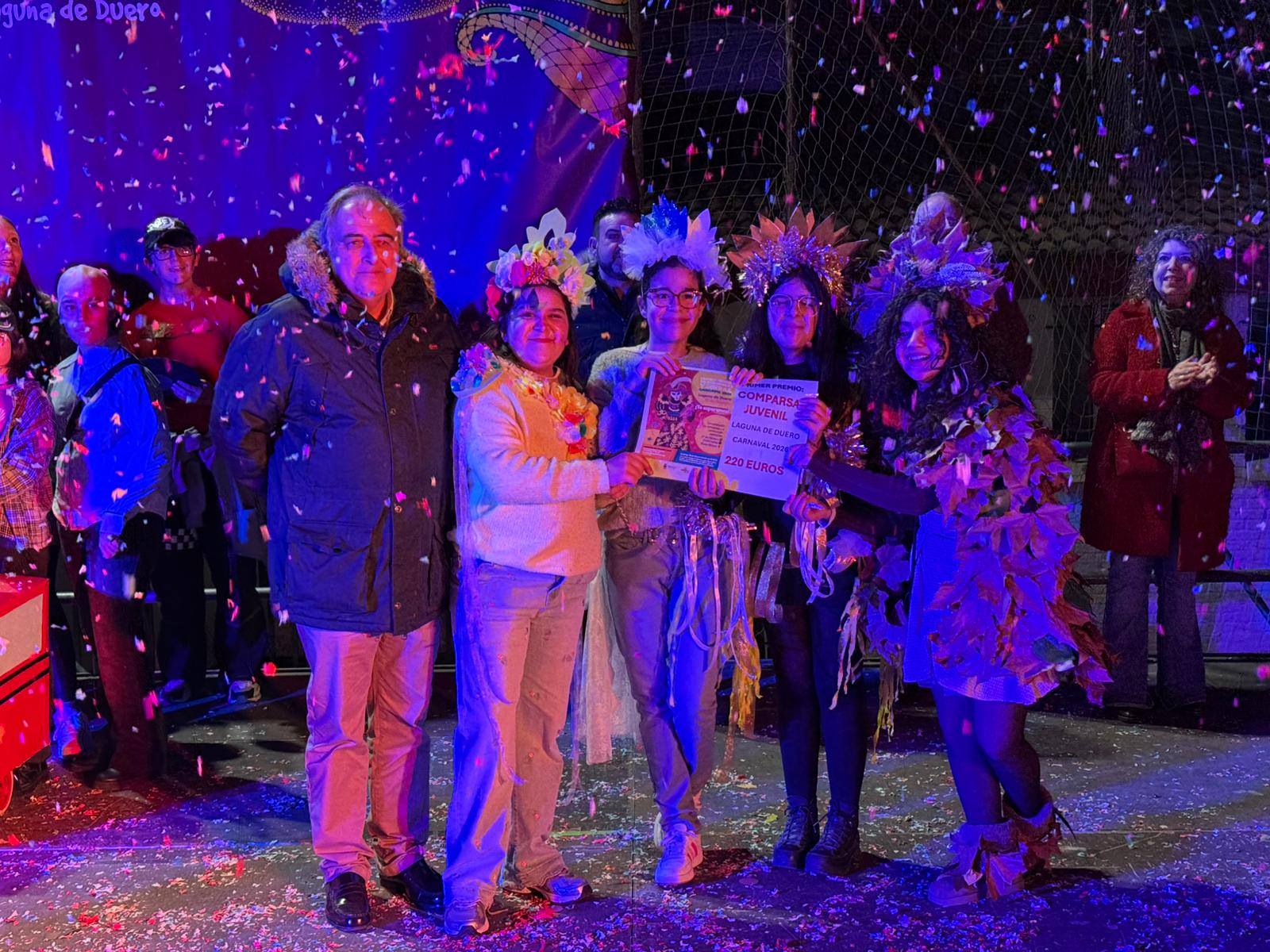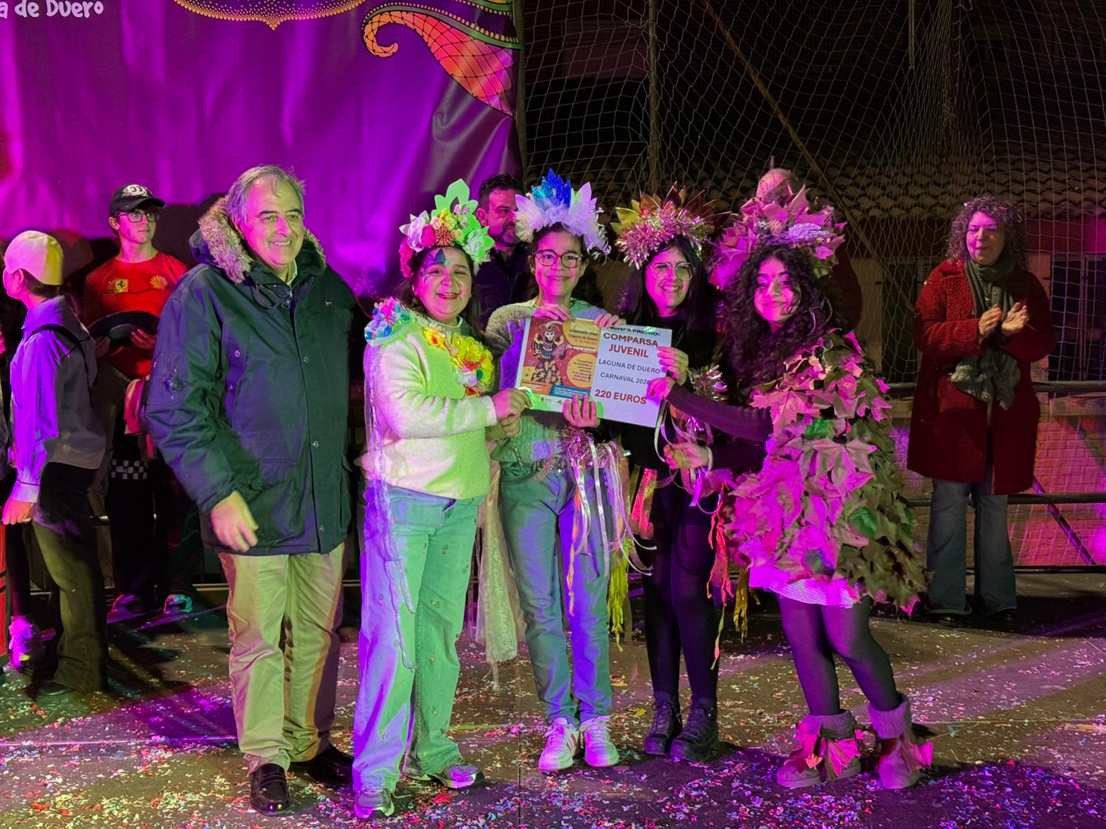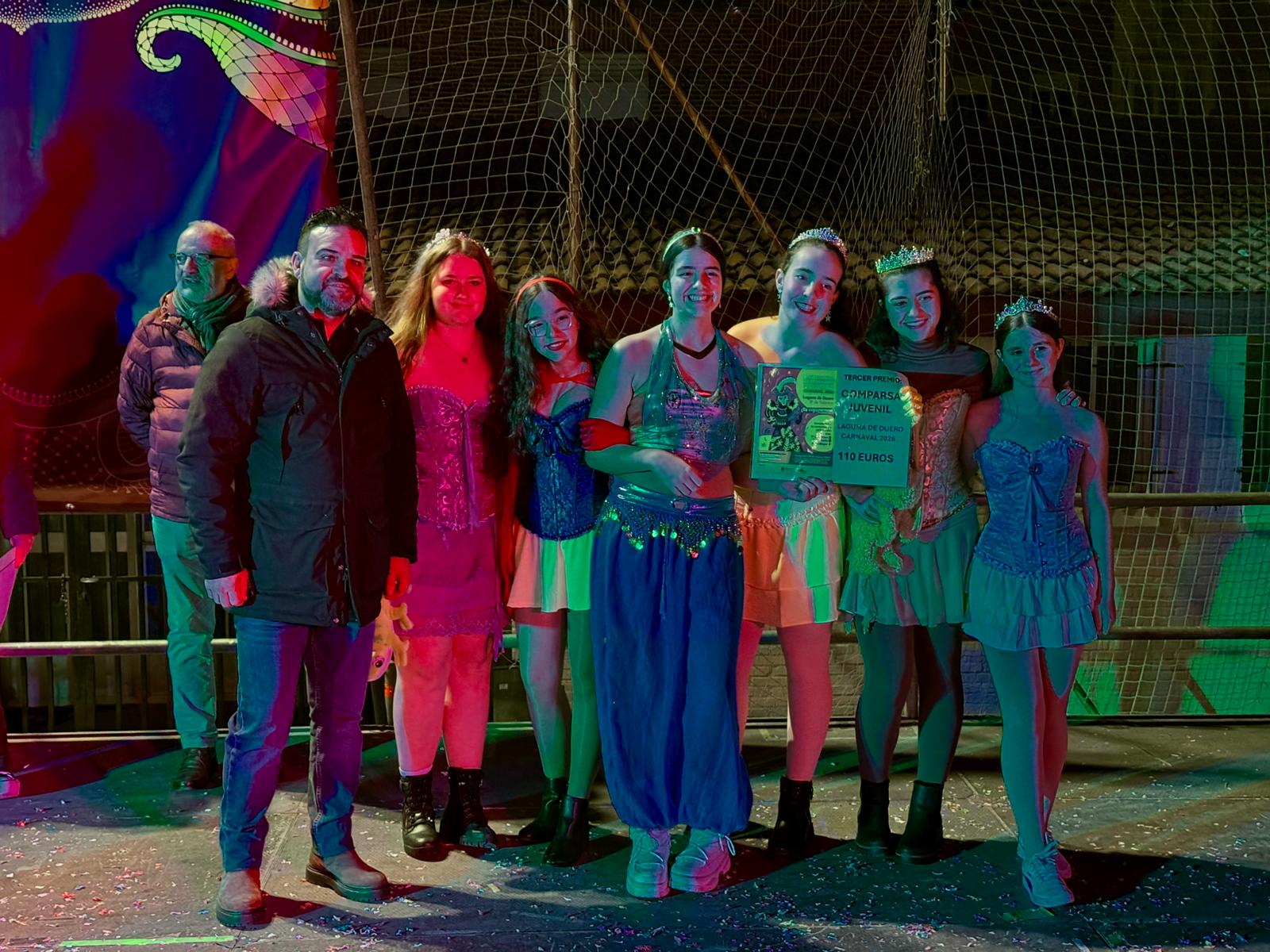 En comparsas juveniles, el primer premio, de 220 euros, fue para “El Reino de las Estaciones”. El segundo premio, de 165 euros, recayó en “¿Quieres saber cuánto vale tu coche?”, y el tercer premio, dotado con 110 euros, fue para “Seis del Rebaño”.