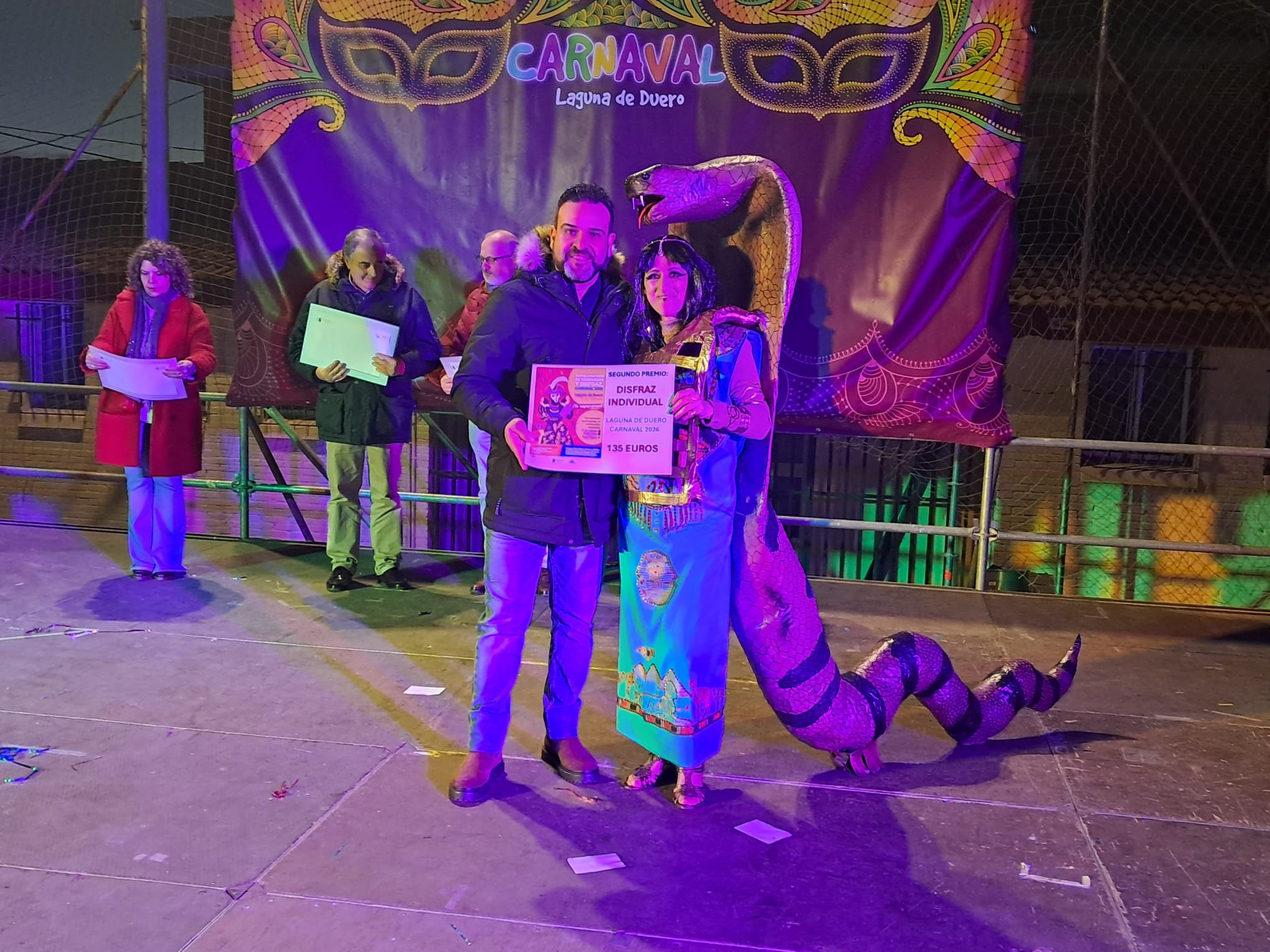 En la categoría de disfraz individual, el primer premio, dotado con 215 euros, fue para “Mariscada para dos”, mientras que el segundo premio, de 135 euros, recayó en “La Diosa Cobra”.