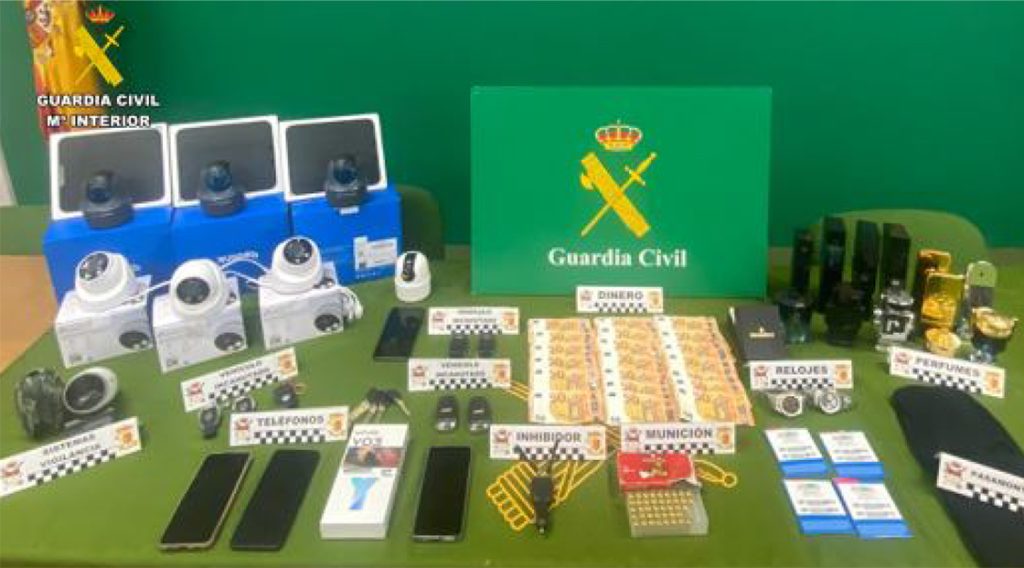 Tras varias entradas y registros en distintos domicilios, los agentes lograron intervenir dispositivos eléctricos, documentación de interés, unos 1.000 euros, perfumes, cámaras de video-vigilancia, relojes, munición, inhibidores de frecuencia, así como la intervención de cuatro vehículos.