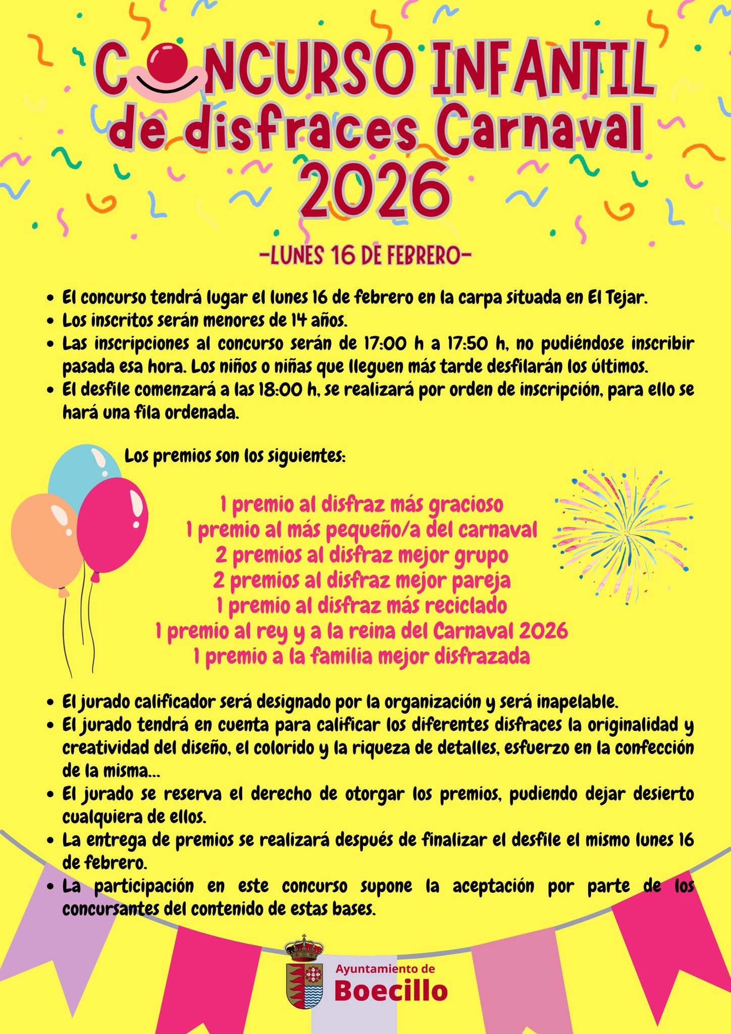 Por su parte, el concurso infantil está pensado para menores de 14 años y las inscripciones se realizarán el mismo día de 17:00 a 17:50 horas para comenzar el desfile a las 18:00 horas. En este caso, los premios estarán dispuestos por las siguientes categorías: más gracioso, pequeño carnaval, mejor grupo, mejor pareja, más reciclado, rey y reina del Carnaval 2026 y mejor familia disfrazada. El jurado valorará diseño, creatividad, colorido, esfuerzo y riqueza de detalles.