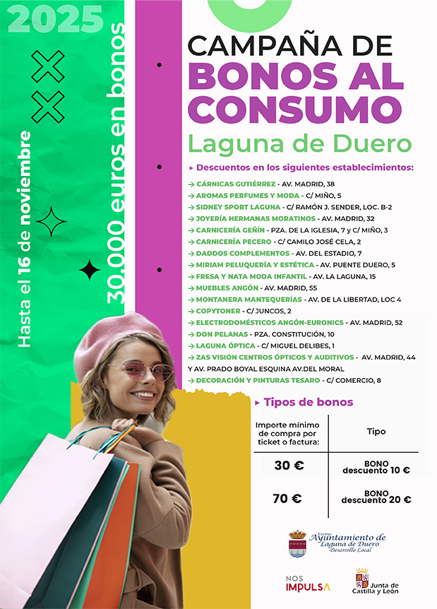 El Ayuntamiento de Laguna de Duero, a través de la Concejalía de Desarrollo Local y en colaboración con la Dirección General de Comercio y Consumo de la Junta de Castilla y León, ha lanzado ya una nueva Campaña de Bonos al Consumo para reactivar el comercio minorista de la localidad. Se trata de una iniciativa que tiene como objetivo dinamizar la economía del municipio a través de la entrega de 30.000 bonos de descuento por comprar en los establecimientos de Laguna.