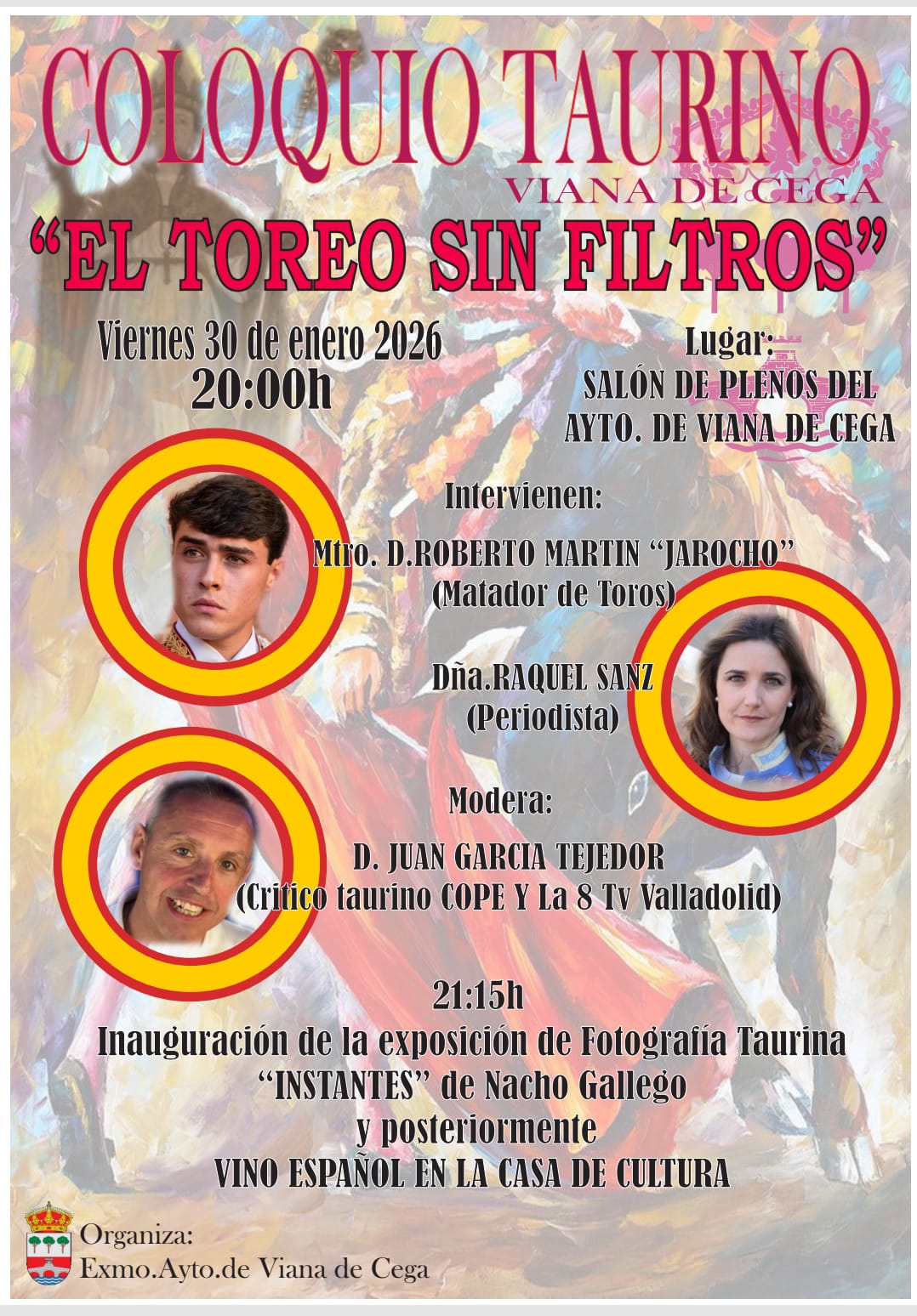 Además, complementando el programa taurino, el viernes 30 el salón de plenos volverá a albergar el coloquio taurino -con temática ‘El toreo sin filtros’-, donde en esta ocasión intervendrán el matador Roberto Martín ‘Jarocho’ y la periodista Raquel Sanz, y todo ello moderado por el crítico de la Cope y de la La 8 de Valladolid, Juan García Tejedor. Alberto Collantes ha destacado que tras esta cita, tendrá lugar la inauguración de la exposición de fotografía de Nacho Gallego, ‘Instantes’. «Nacho es vecino del pueblo y teníamos pendiente traerlo a Viana, así que creemos que esta es una muy buena oportunidad de mostrar su talento con una exposición que se podrá visitar durante todas las fiestas».