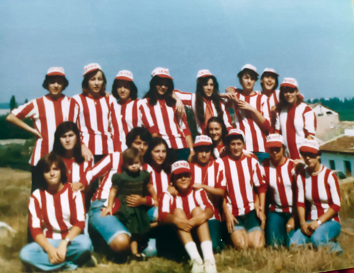 Pero ellas se deshicieron de los estereotipos y “aunque llamábamos mucho la atención, tuvimos unos padres que nos apoyaron en nuestra decisión, lo que sumado a la unión que había entre nosotras nos animó a continuar”. Así, en septiembre de 1975, ‘Las Rayas’ celebraron sus primeras fiestas como peñistas, y su nombre llegó de algo tan sencillo como su indumentaria, pues en estas primeras patronales de la Virgen del Villar, las jóvenes compraron camisetas con rayas horizontales azules y blancas, que pronto cambiarían por otras con rayas verticales rojas y blancas y con un número en la parte de atrás. Entre risas, recuerdan cómo este segundo vestuario hacía que, cuando se las veía aparecer, algún vecino gritase “¡ahí vienen las del Atleti!”, a lo que ellas respondían que no, que ellas eran “las de Las Rayas”.