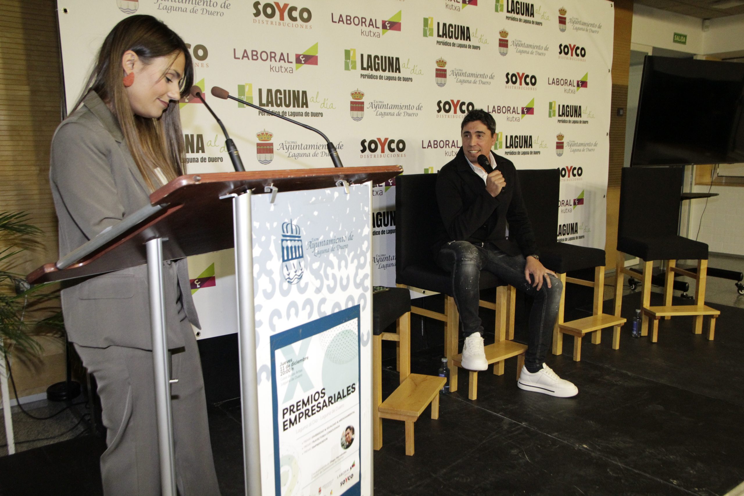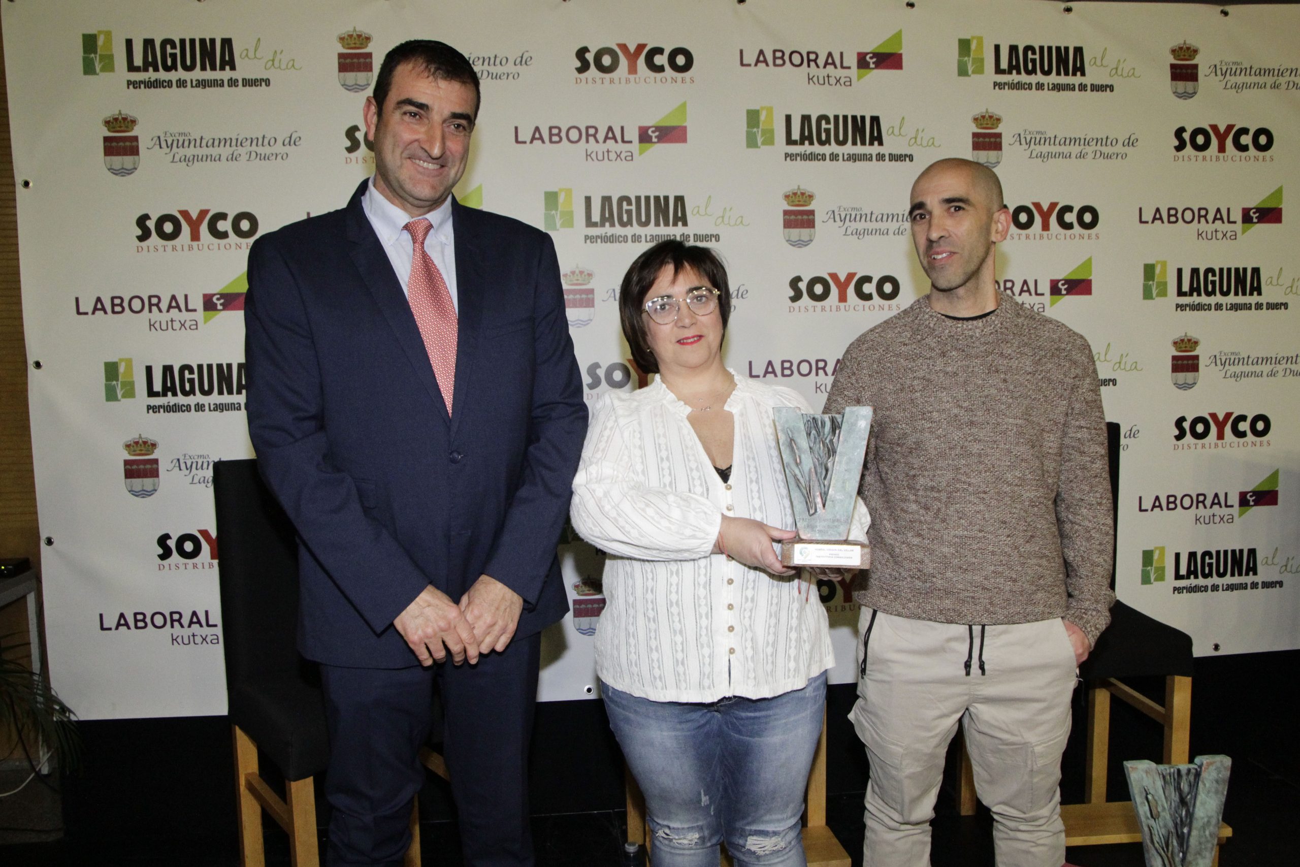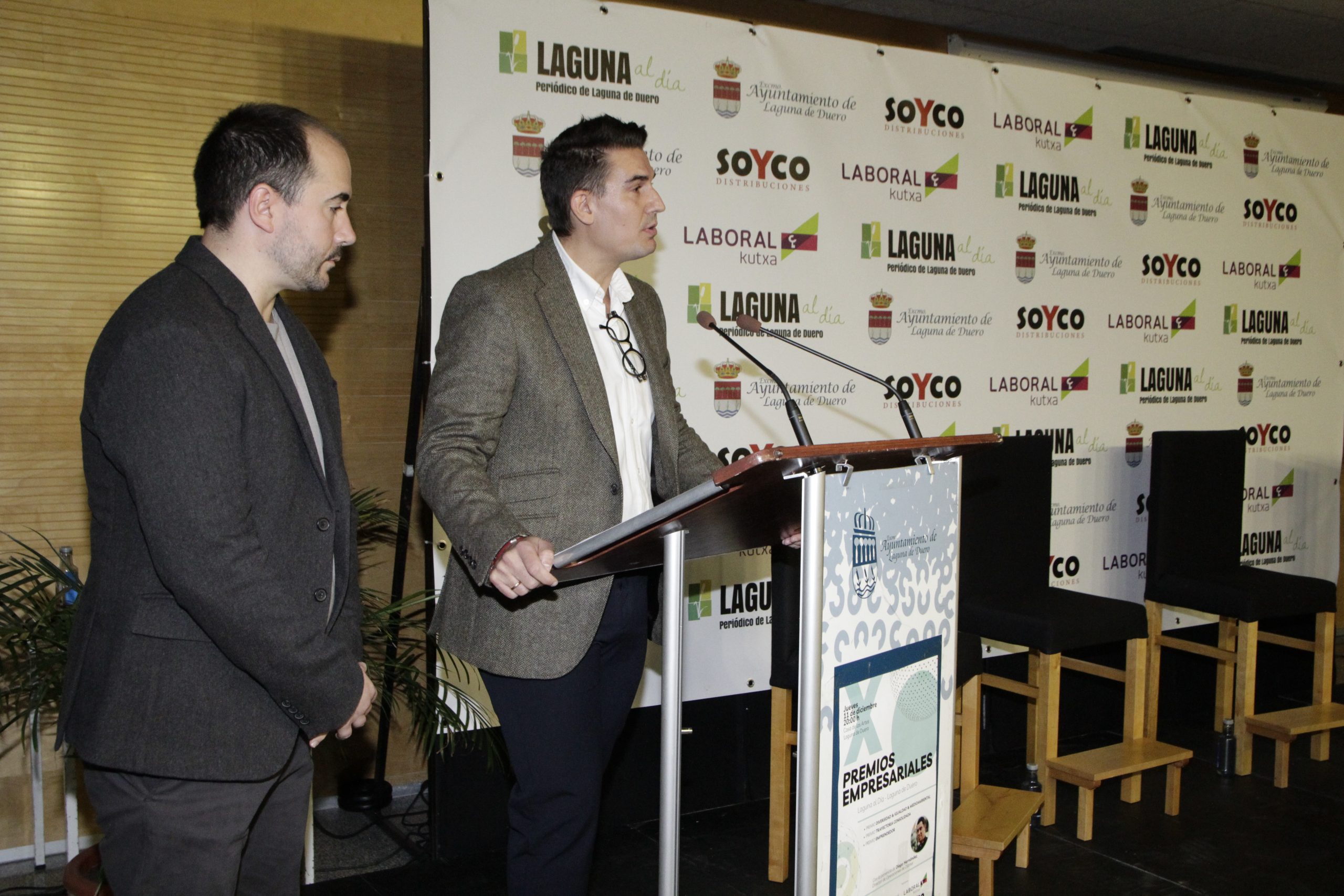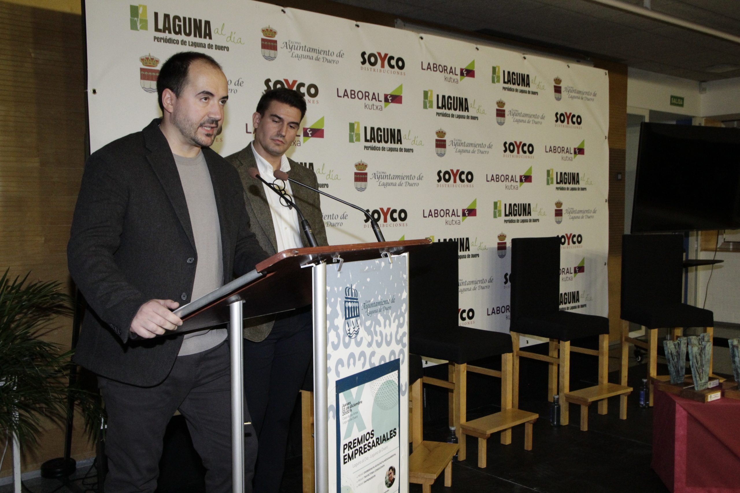 La cita contó nuevamente con la periodista Lidia Veiga como maestra de ceremonias y, como ya es habitual, el inicio de la gala estuvo protagonizado por la intervención de Joaquín Vicente y Jorge Lera, responsables de Laguna al día, quienes agradecieron al Consistorio y a todas las empresas y asociaciones «que hacéis posible año a año que estos premios sean una realidad», así como a los patrocinadores SOYCO Distribuciones y Laboral Kutxa. «Estos premios cumplen una década, un período en el que hemos visto pasar cerca de una treintena de premiados, hemos presenciado una gran transformación y en el que queda claro que, con trabajo, ideas y proyecto, las iniciativas empresariales salen adelante», señalaron los directores del medio, quienes agradecieron también a CEOE Valladolid, Fecosva, AICOSLA y la Asociación de Hosteleros de Laguna de Duero su colaboración en los premios, como parte del jurado.