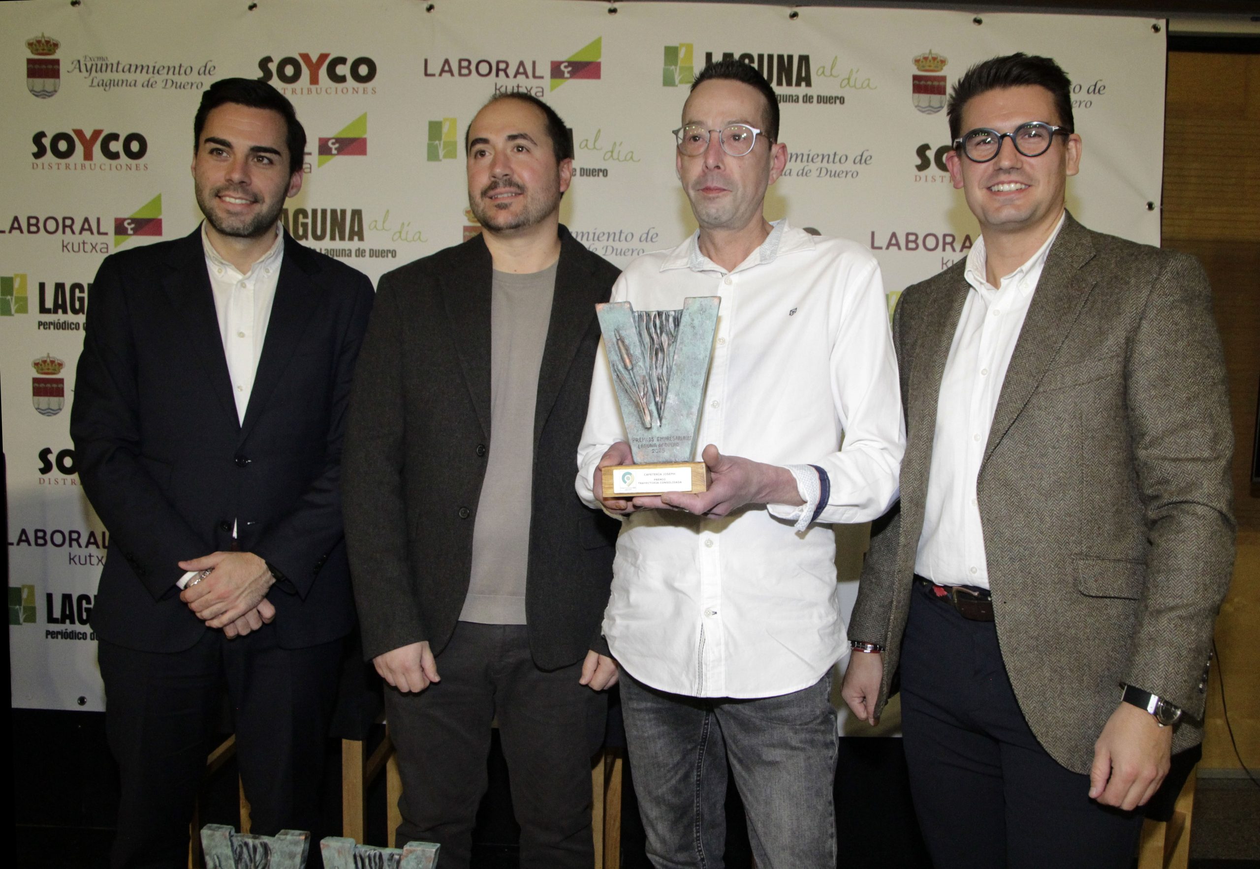 De la misma manera, el premio a la Trayectoria Consolidada, que este año es ex aequo, fue para Cafetería Joseph & Royal, donde Jesús Pérez fue el encargado de recoger el premio de manos de Jorge Lera y Joaquín Vicente, de Laguna al Día, y del diputado provincial de Desarrollo Económico, Roberto Migallón. Asimismo, en esta misma categoría, el otro premio fue para Hostal, Restaurante y Cafetería Virgen del Villar, que en este caso lo recogió David y Celia Garcinuño Hernando, a quienes se lo entregó Fernando Vara, concejal de Desarrollo Local del Ayuntamiento de Laguna de Duero.