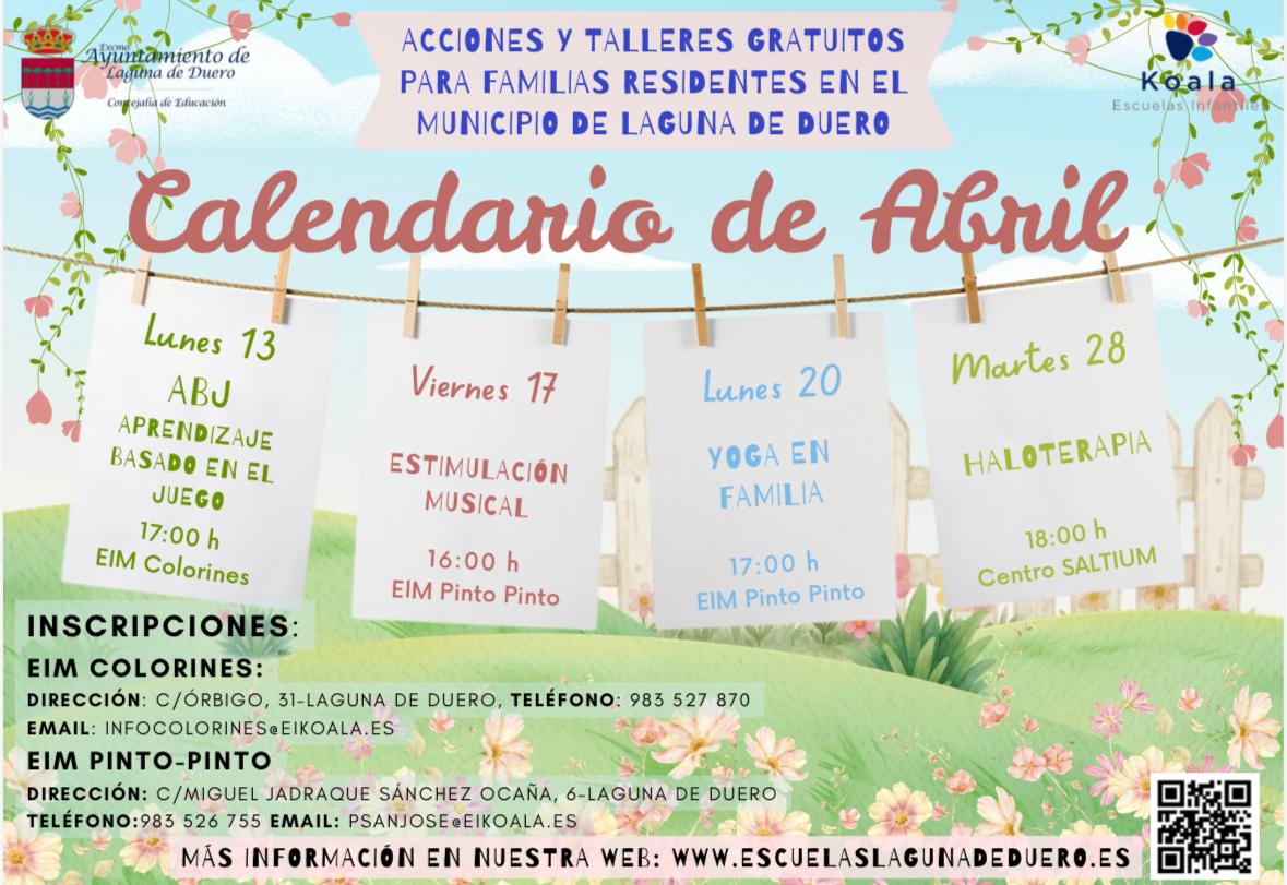 Las Escuelas Infantiles Municipales de Laguna de Duero, Pinto Pinto y Colorines, han comenzado una nueva programación de talleres dirigidos a las familias con niños entre 0 y 6 años durante el mes de abril. Estas actividades se encuentran dentro del Plan de Acciones y Talleres Abiertos al Municipio del curso 2025-2026, con el fin de ofrecer espacios de aprendizaje y convivencia para las familias de Laguna.