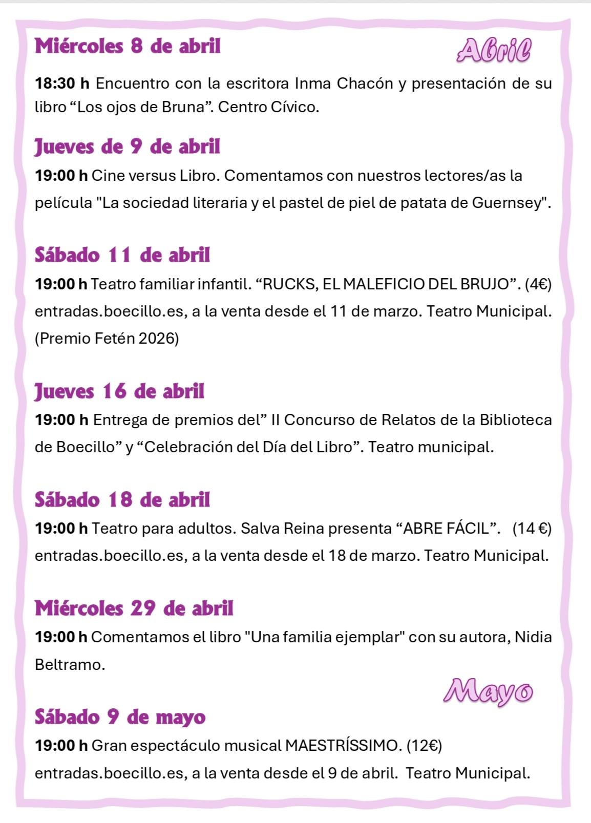 El jueves 16 de abril será la entrega de premios del II Concurso de relatos de la Biblioteca de Boecillo, junto a la Celebración del Día del Libro. El sábado 18 de abril, llegará otra cita teatral con la comedia ‘Abre fácil’, por Salva Reina, cerrando así el calendario cultural de abril el miércoles 29 de abril con un encuentro literario con Nidia Beltramo, en el que se comentará su libro ‘Una familia ejemplar’.
